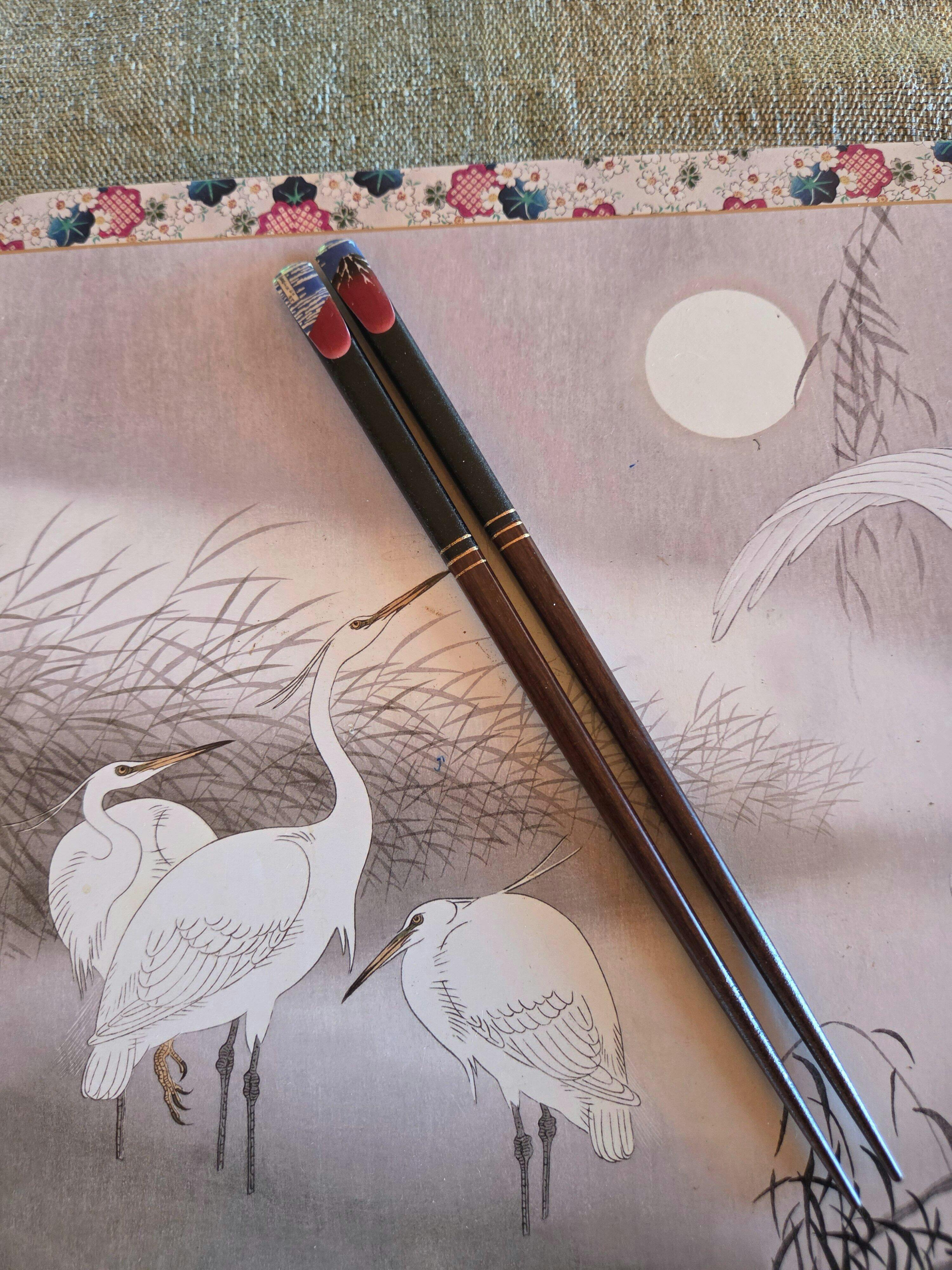 The black handles have a rough dry lacquer finish, giving it a refined and calming aesthetic and feel. When you hold these chopsticks, you are literally holding a piece of Japanese artistic history in your hands.